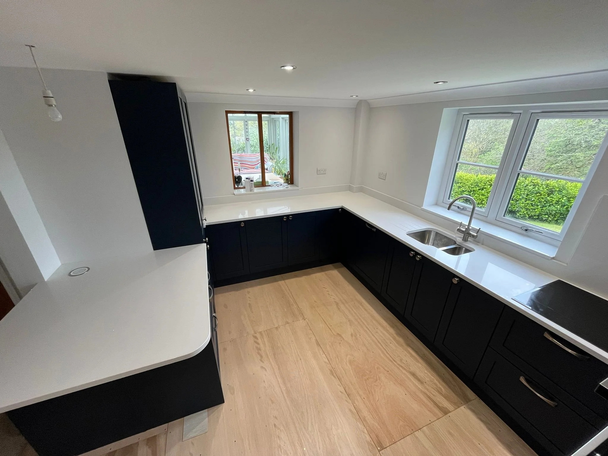 In the quiet heart of the home, the fitted kitchen stands as both statement and sanctuary, dressed in Hawkshaw Midnight Blue. The cabinetry, deep and velvety, absorbs the light by day and reflects a soft, ambient glow by evening, giving the room a sense of calm confidence. Each door and drawer sits perfectly aligned, its craftsmanship understated yet unmistakable.